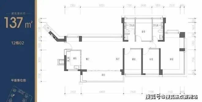 137㎡的4房2厅2卫,设计的是横厅南北通透格局,超宽展面,动静分区,五开间朝南,主卧三面观景飘窗,L型厨房,公卫三段式分离,得房率约90%(包含赠送)。
