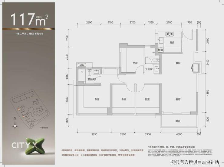 108平的户型拥有约3.6米开间,全南向客厅和卧室。