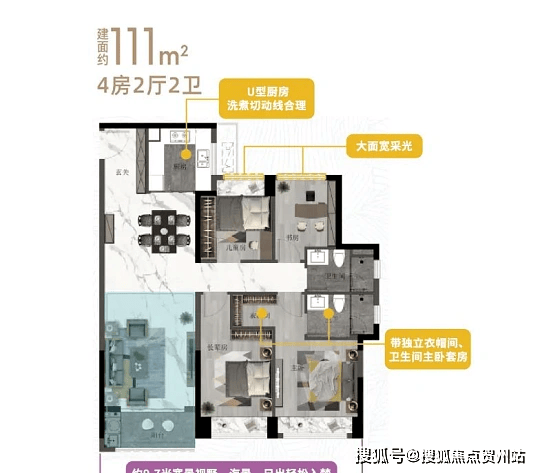 110㎡四房两厅两卫:南向主阳台,南北通透,中高楼层可享山海双景,总价 275-308 万。