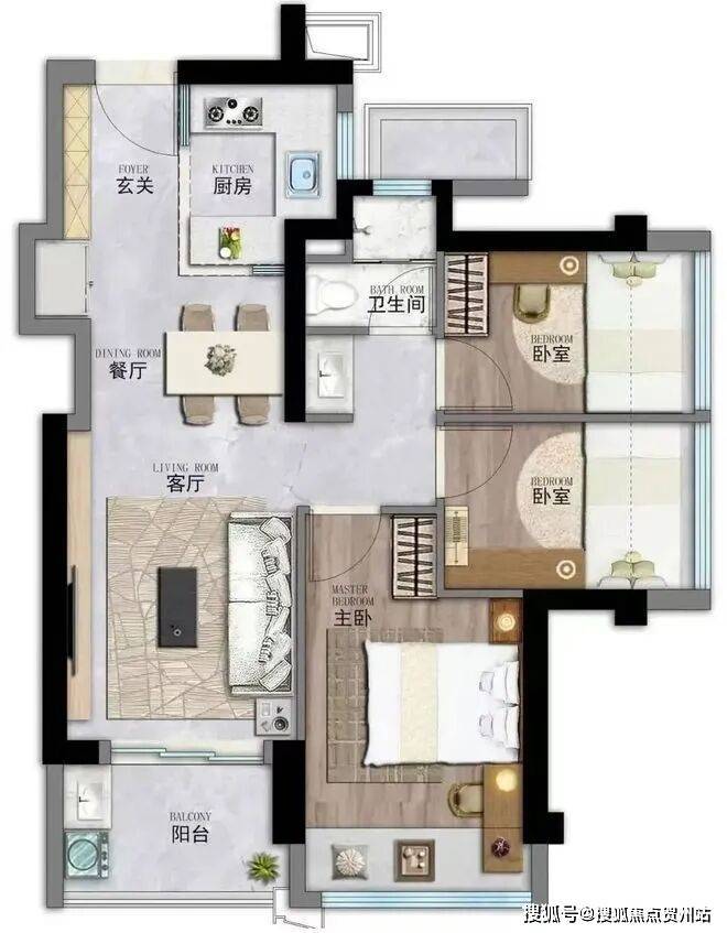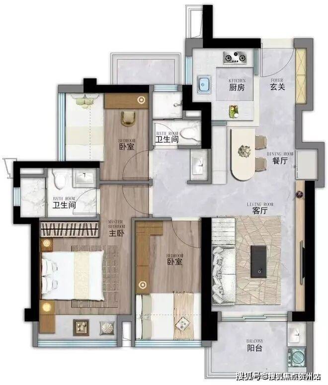 86㎡的3房2厅2卫,设计的是竖厅格局,进门入户玄关,客厅3.2米开间,LDKB一体化,S墙设计预留冰箱位,三开间朝南,3个卧室分别做到了3米/2.4米/2.4米的宽度,U型厨房,公卫三段式分离,还带1个设备平台可以使用,得房率约:89%(包含赠送),阳台有东南或西南朝向。