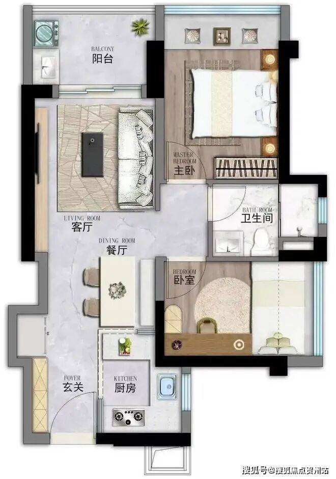 63㎡的2房2厅1卫,设计的是竖厅格局,进门入户玄关,客厅3米开间,LDKB一体化,S墙设计预留冰箱位,2个卧室分别做到了2.8米/2.35米的宽度,U型厨房,卫生间干湿分离,得房率约:88%(包含赠送),阳台西北朝向。