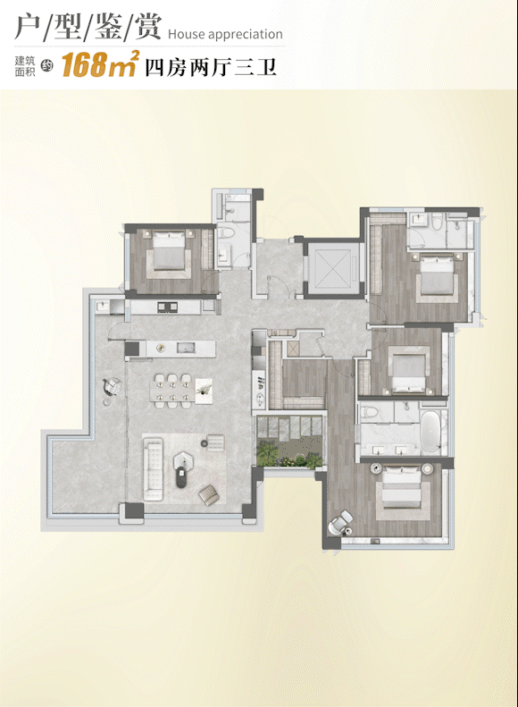 约168㎡四房:专梯专户配置,3阳台设计+双"全景舱",约40㎡行政主卧套房