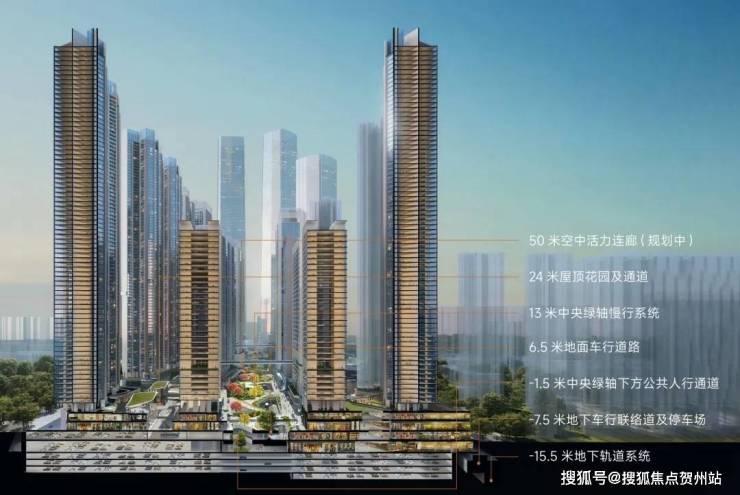 创新打造地上地下七重结构立体化交通系统,不同交通系统分层互联,人行系统、城市公共道路系统、地下轨交系统快速接驳,最大程度实现人车分流,科学化疏解交通压力。