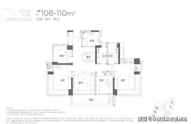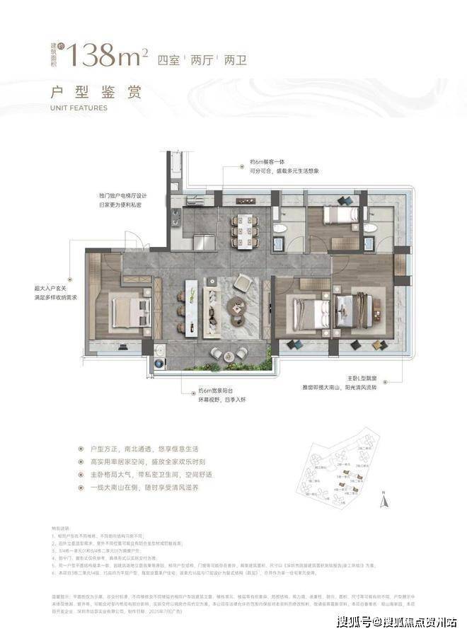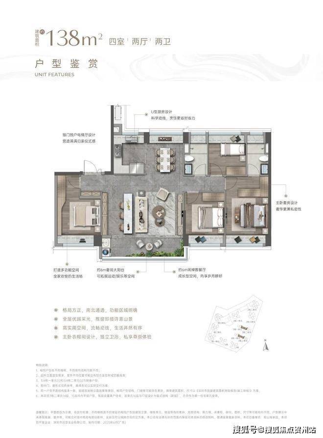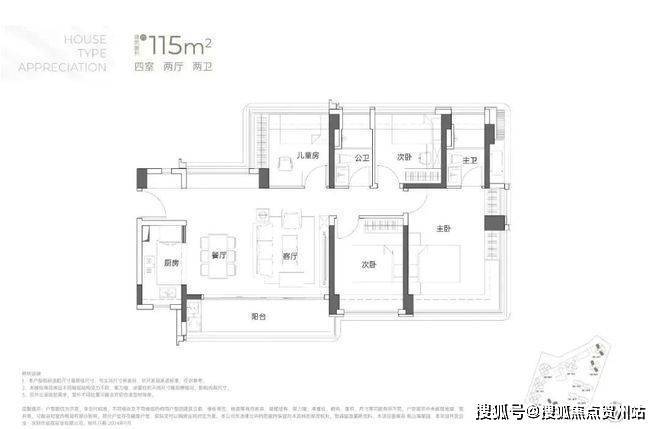 竖庭格局,西南向,基本居住功能与建面约108-110㎡4房2卫一致,但格局不一样,从目前公布的户型图上看,主要是主卧空间有了更大的提升,比如可以放更大一点的衣柜。