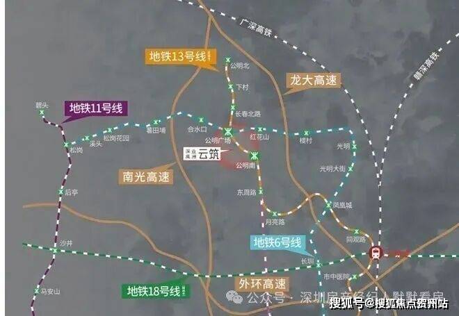 深业云筑,位于深圳市光明区公明街道马田街道石家社区,地处光明科学城大科学装置区,紧邻地铁6号线公明广场站(1.1公里)及在建13号线公明南站(约700米),未来可直达南山科技园、后海总部基地;周边龙大、南光高速无缝衔接福田、南山,交通便捷。