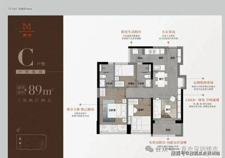 89㎡的3房2厅2卫,A户型(1栋1单元06户型),设计的是经典竖厅格局,进门入户玄关,LDKB一体化,S墙设计预留冰箱卡槽位,三开间朝南,动静分区,主卧双面大飘窗,客厅连接次卧出5.6米长的观景阳台,U型厨房,公卫三段式分离,得房率76.78%(不含赠送),套内面积69.1㎡,东南朝向。