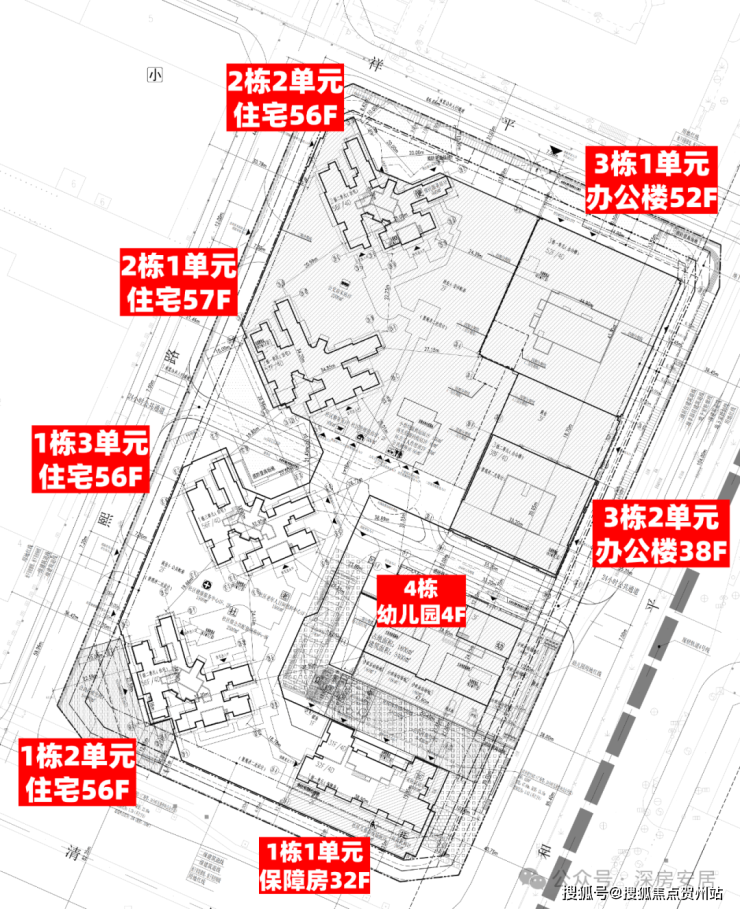 ,「鸿荣源·宸玺花园」最新平面图已出,与之前城市更新版有所调整,规划4栋商品房、1栋保障房、2栋办公楼和1栋幼儿园,其中住宅最高57层。