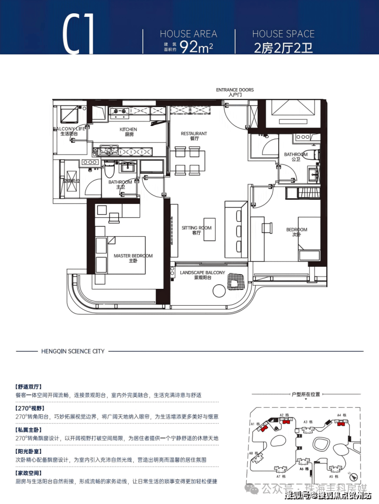 横琴科学城一期,仅6栋568席准现房住宅,建筑面积约94-100㎡精致户型,精装交付,两室及三室格局,皆以人性化设计满足多样生活需求。