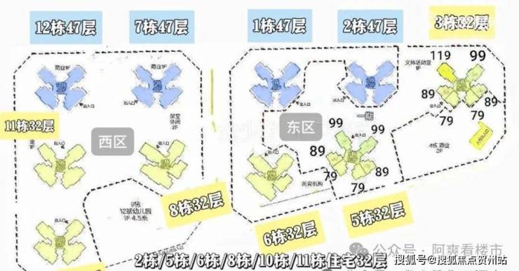 西区:占地2.2万㎡,容积率5.16,包含住宅、商业、幼儿园学校和其它基础配套设施。7/12栋47F,3T6户;8栋32F,2T5户;10/11栋32F,2T6户;9栋幼儿园。