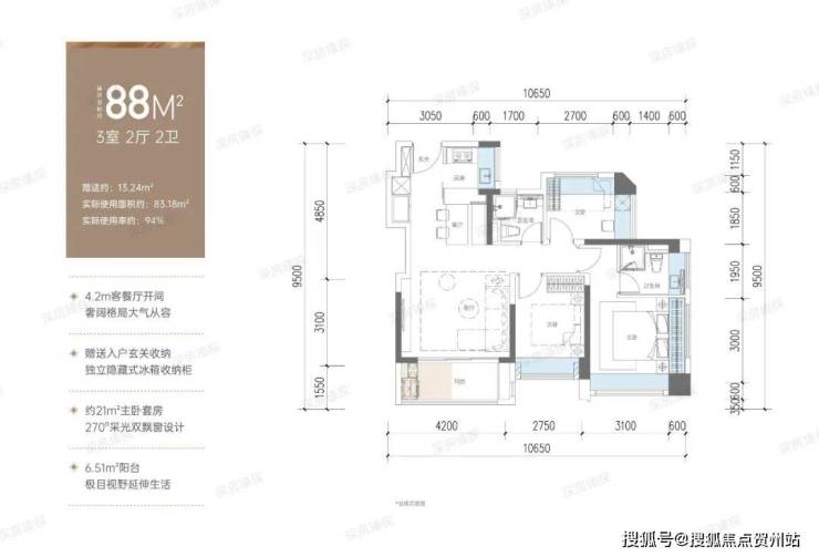 88㎡的3房2厅2卫,设计的是竖厅格局,进门独立玄关,LDKB一体化设计,客厅4.2米开间,S墙设计预留冰箱位,3个卧室分别做到了3.1米/2.75米/2.7米的宽度,U型厨房,得房率:94%(包含赠送),阳台有西南或东南朝向。