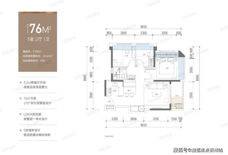 76㎡的3房2厅1卫,设计的是竖厅格局,进门独立玄关,LDKB一体化设计,客厅3.5米开间,S墙设计预留冰箱位,3个卧室分别做到了3米/2.9米/2.3米的宽度,U型厨房,得房率:91%(包含赠送),阳台有西南或东南朝向。