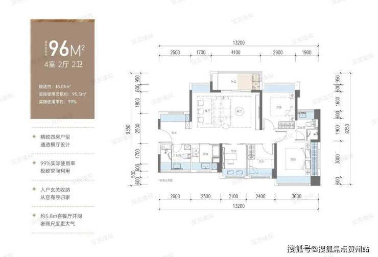 96㎡的4房2厅2卫,设计的是横厅南北通透格局,进门独立玄关,客餐厅5.8米开间,4个卧室分别做到了3.6米/2.9米/2.4米/2.1米的宽度,全屋飘窗,U型厨房,得房率:99%(包含赠送),阳台主朝西北或东北向。