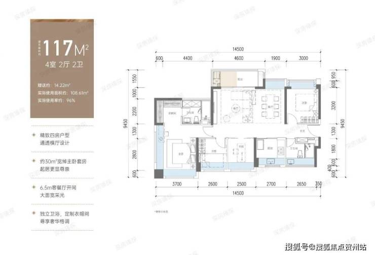 117㎡的4房2厅2卫,折后总价330万起,单价约2.82万/㎡。
