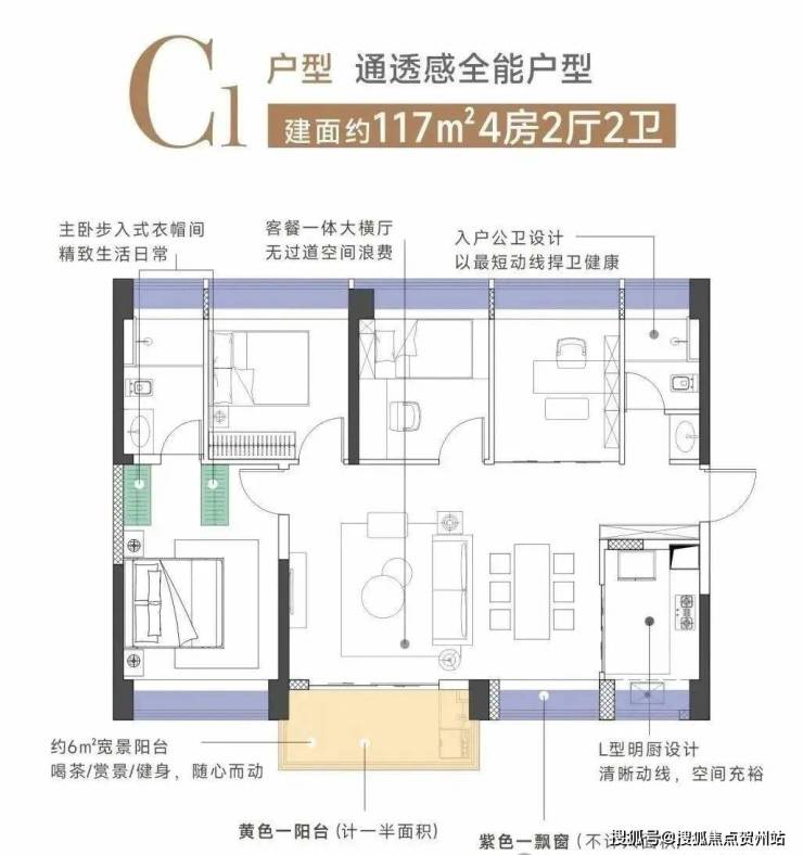 建面约117㎡横厅4房2厅2卫,与116㎡同个面积在横厅设计,自然是可以满足南北通透的需求。