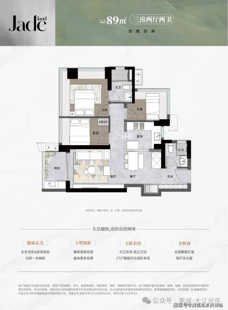 89㎡三房两卫(总价约400万):三开间朝南,主卧与次卧配备270°飘窗,采光优越,L型洄游厅提升空间感,兼顾实用性与舒适度。