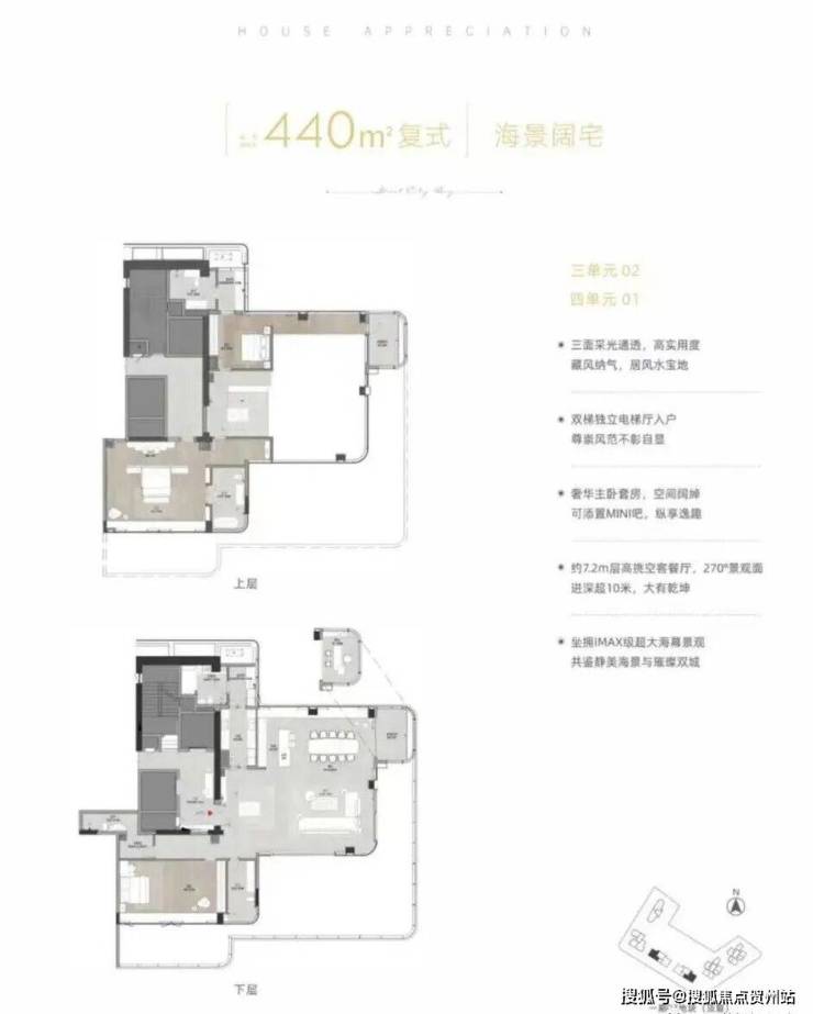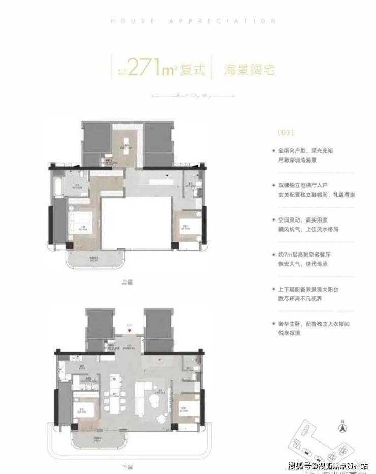 高区面积:270平4房+1工人房+4卫270平复式(13.4万/平起步价)4梯3户(毛坯27楼以上户型)