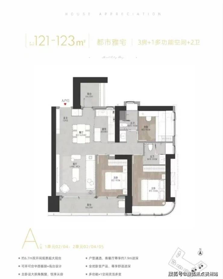 A 户型,西南朝向122-124 平(04、05)看红树林湿地及海景总价区间:1241万~1436万单价区间:10.1万~11.57万