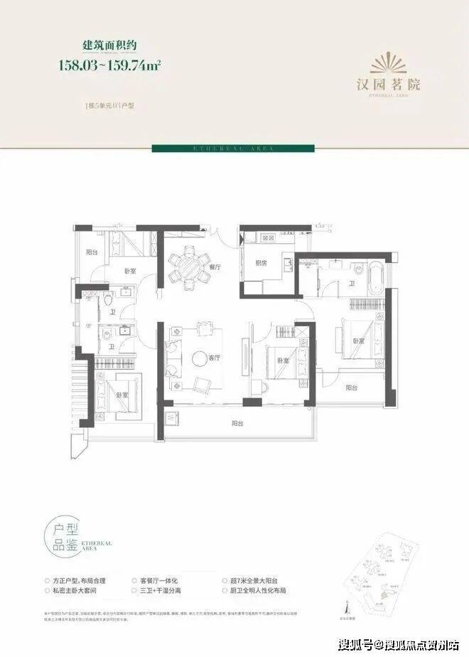 该户型比较方正,面积段在158-159平米左右4房2厅3卫,布局较为合理。餐厅和客厅一体化,同时餐厅紧邻厨房,空间利用度较高。主卧空间较大,为整体套房设计,且自带阳台,通风性好。值得一提的是,该户型有一个超7米的全景大阳台,如果在高楼层,景观肯定不错。