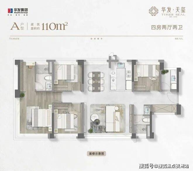约110㎡四房两厅两卫:约16米通风面,户户是端户;约28㎡行政级端卧套房,270°景观视野,360°环统式采光。