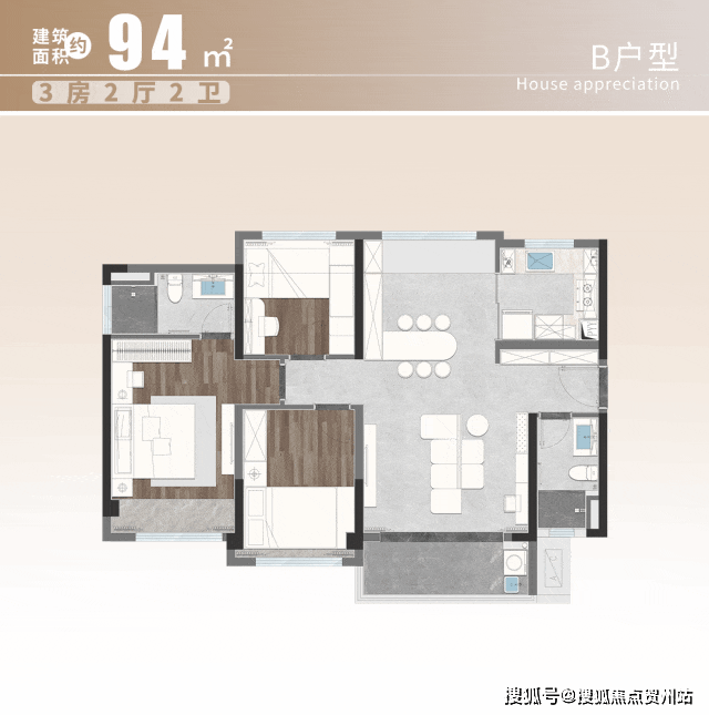 刚需优选:建面 83-87㎡三房两厅两卫,四开间朝南,客厅开间 3.45 米,主卧套房设计,采光充足。