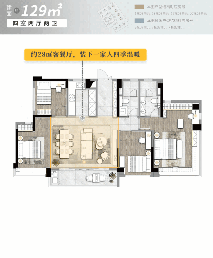 建筑面积约129㎡海景高层,以大四房的王者格局,实现改善进阶一步到位。