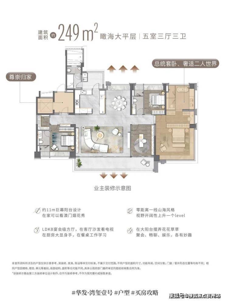 这款五室三厅三卫的户型,拥有约11米的巨幕阳台,居家时可以观赏澳门的烟花秀,零距离感受一线山海风光。