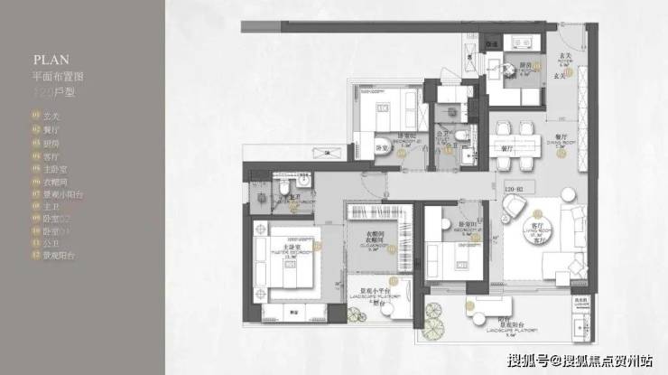 120㎡的4房2厅2卫,竖厅格局,客厅与卧室连通9.6㎡超大阳台,主卧带5.2㎡衣帽间,还有观景小阳台,主要为东南和西南朝向。