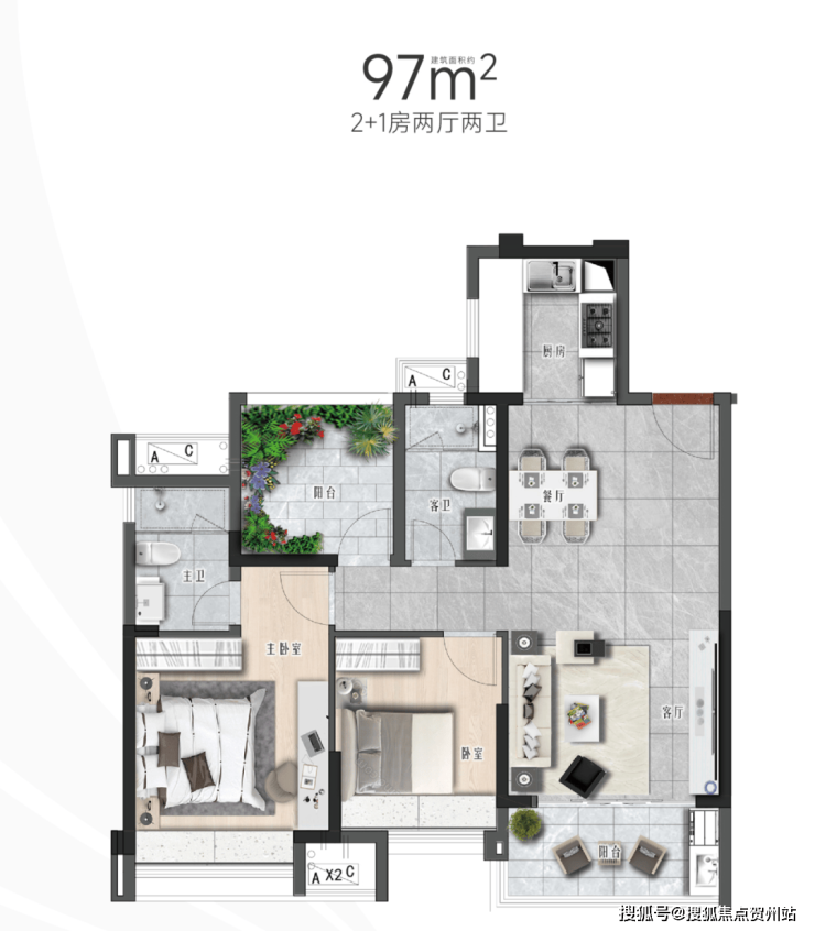 建面约97㎡,2+1房设计,空间宽敞舒适,三开间朝南,南向看园林,一家三口理想居所。