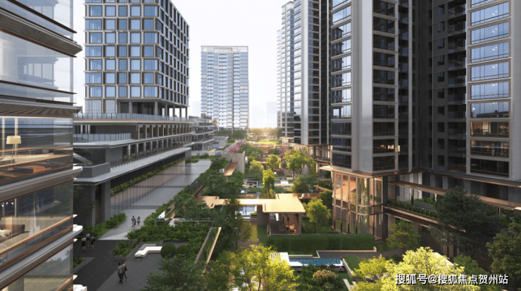 项目整体绿化率约40%,还打造了近9000㎡下沉式庭院,配置了多功能水院会所、室内景观泳池、全龄儿童生活场、林下休憩空间等。