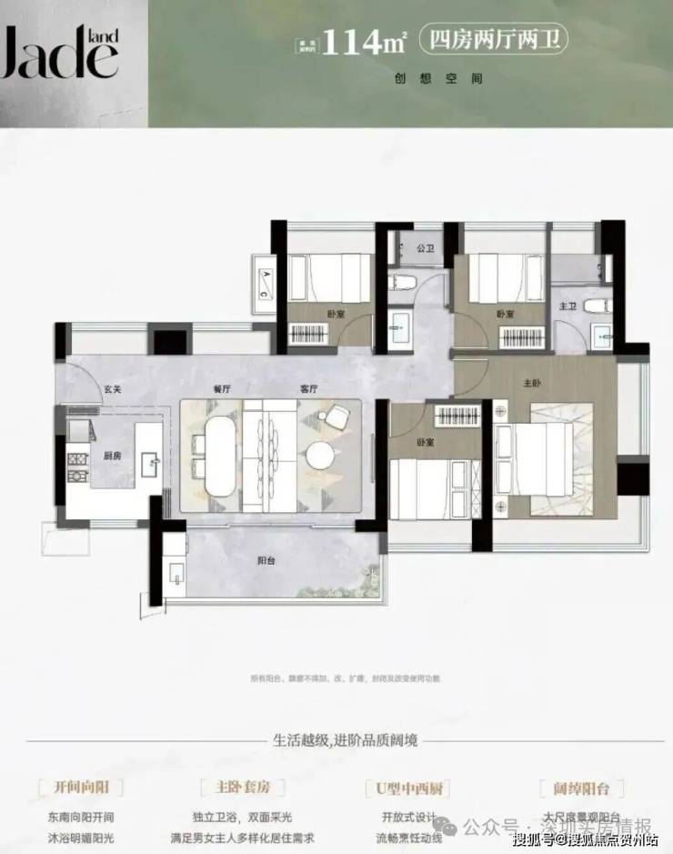 114平㎡的4房2厅2卫,设计的是横厅南北通透格局,进门入户玄关,LDKB一体化,五开间朝南,全屋9面飘窗,主卧大套间,U型厨房,卫生间干湿式分离,得房率约92%(包含赠送),阳台主朝东南向。
