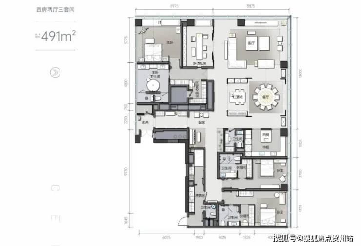 E户型,为约491平的超级大平层设计,为四房两厅三套间。