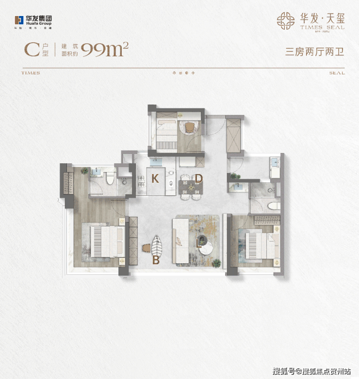 户型:主推建面约 99-114㎡的四房两厅两卫产品,得房率高达约 110%。其中,99㎡户型为 3+1 房,有约 35㎡LDKB 厅,可变双套房;112㎡户型户户是端户,有约 28㎡行政级端卧套房。
