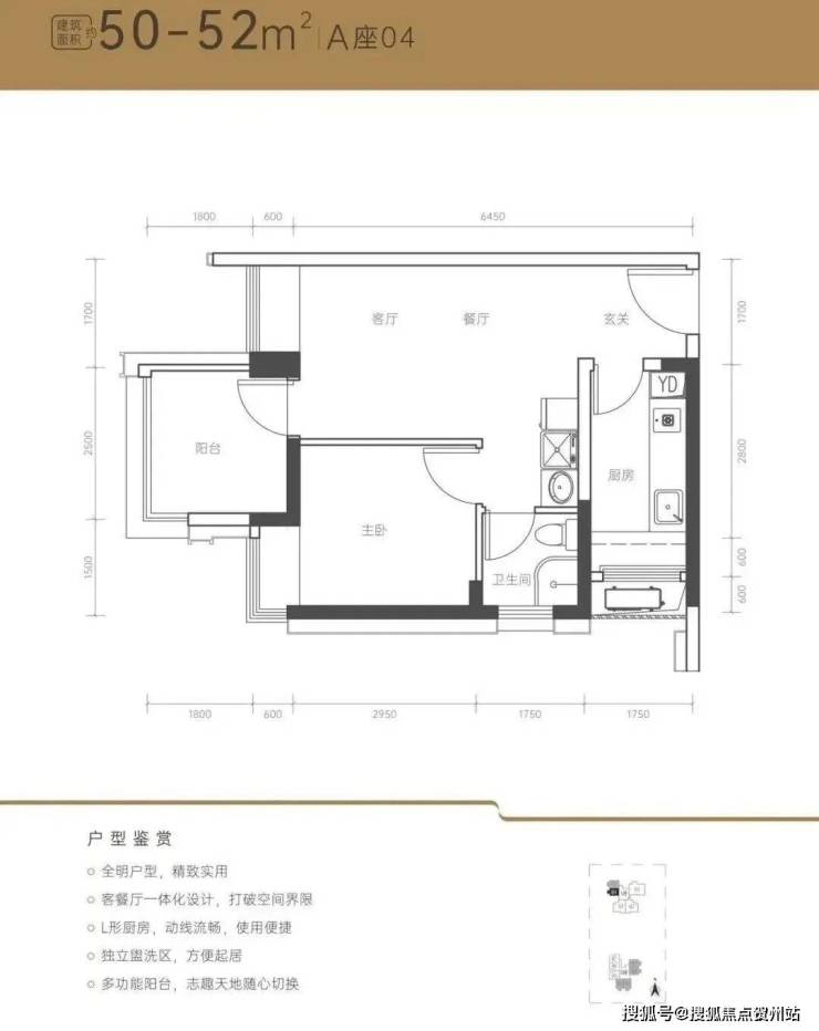 全明户型,精致实用;客餐厅一体化设计,打破空间界限;L形厨房,动线流畅,使用便捷;独立盥洗区,方便起居;多功能阳台,志趣天地随心切换。
