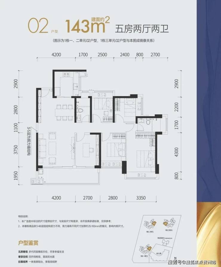 143㎡的5房2厅2卫,设计的竖厅格局,客厅4.2米开间,四开间朝南,5个房间分别是3.35米/2.8米/2.7米/2.5米/2.4米的宽度,客厅连接卧室带6.9米长大阳台,U型厨房,得房率:77.74%(不含赠送),有东南或西南朝向。