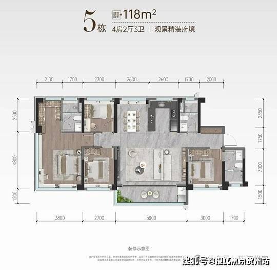 115-118㎡四房两厅两卫:横厅设计,6.8 米宽景阳台,折后单价 2.0-2.3 万 /㎡,总价约 230-270 万