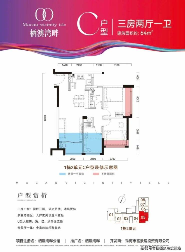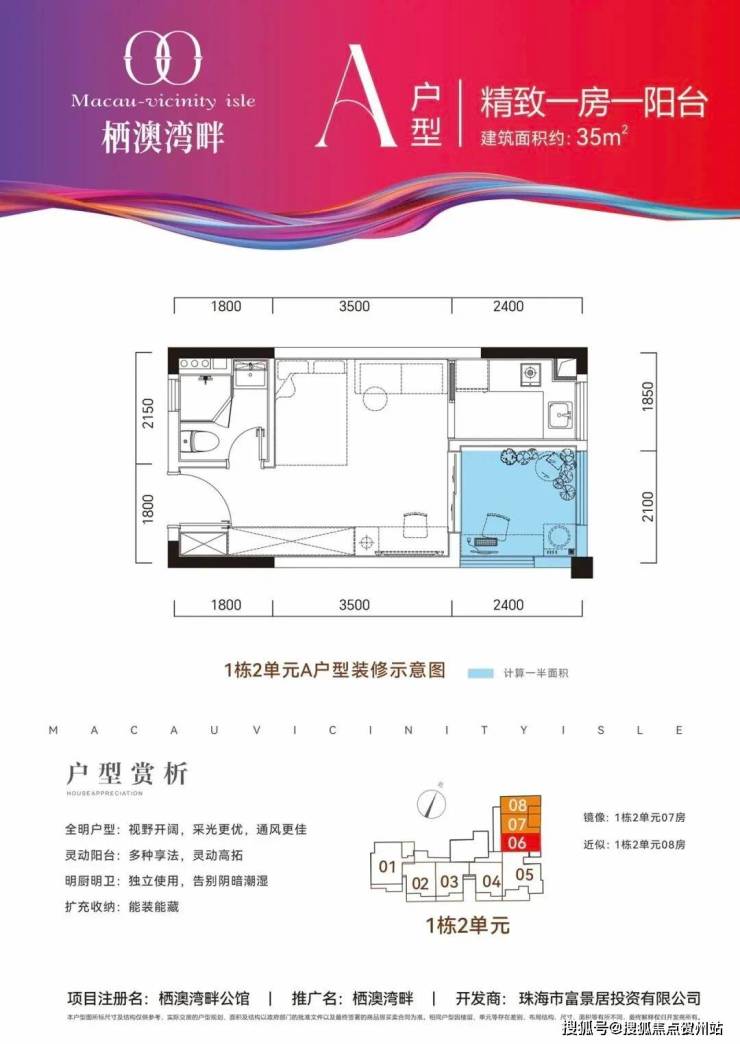 项目地处拱北口岸板块,规划2栋住宅建筑,预计提供约320套住房。产品涵盖一至三房,建筑面积约35-74㎡,民水民电、天然气入户,生活配套较为便利。