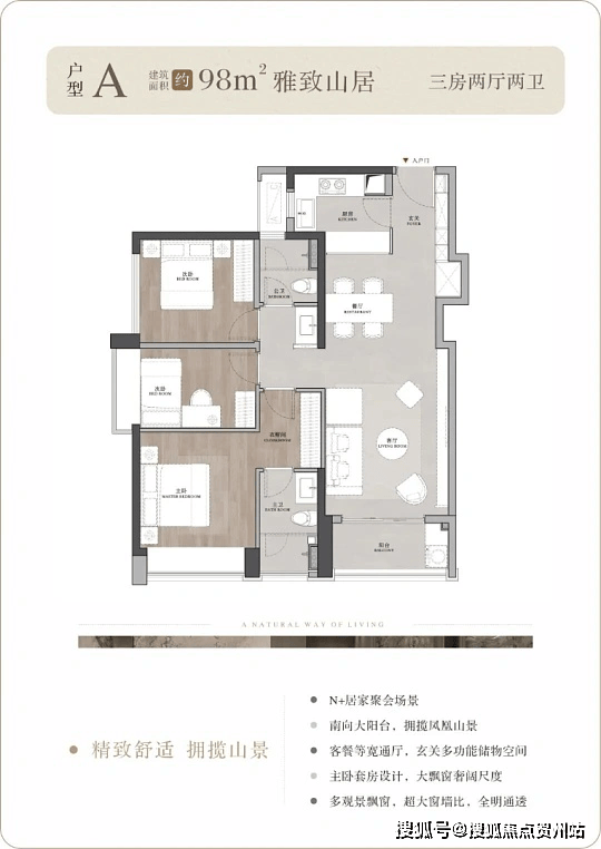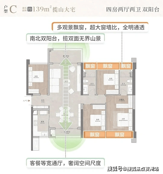 · 户型均采用 LDKG 一体化设计,多为南北通透、双阳台布局,98㎡户型配备 5.8 米巨幕窗,采光观景俱佳。