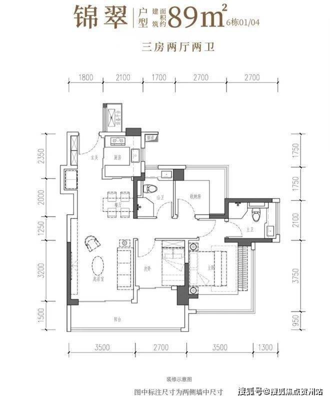 89㎡的3房2厅2卫,6栋01/04户型,经典竖厅,客厅3.5米宽,LDKB一体,S墙预留冰箱位。三开间南向,动静分区。主卧15.25㎡、次卧7.56㎡、次卧6.48㎡(含墙体飘窗),270°转角飘窗。U型厨房外置烟道,卫生间干湿分离。得房率97.47%(含赠送)。客厅连次卧大阳台11.46平,西南/东南朝向。