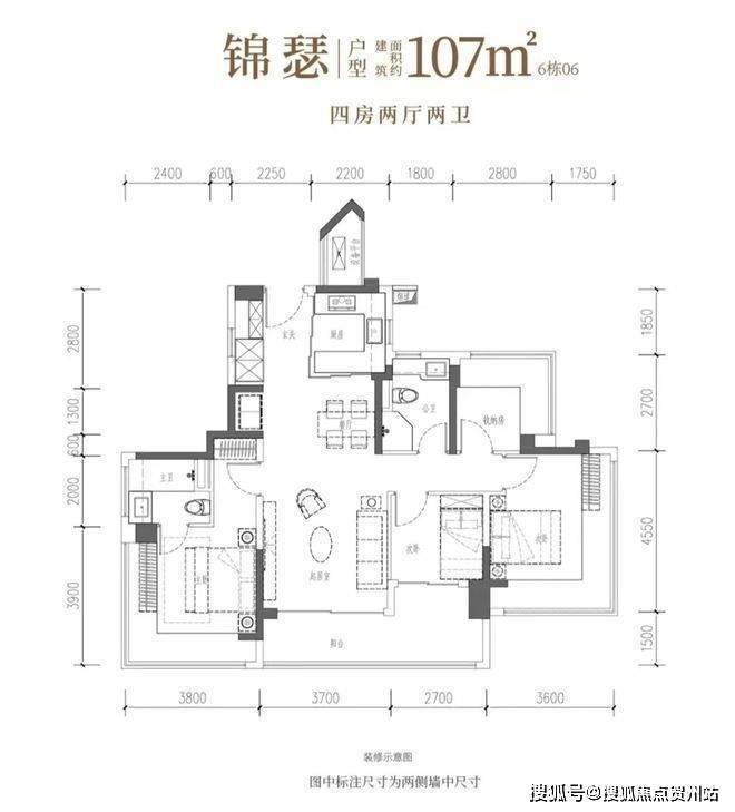 107㎡的4房2厅2卫,设计为竖厅双龙抱珠风格,客厅3.7米宽,采用LDKB一体化布局,预留冰箱位。四室朝南,主卧17.94㎡带270°飘窗,两次卧分别为16.38㎡和7.56㎡,另一次卧6.89㎡。U型厨房外置烟道,卫生间干湿分区。得房率约104.06%(含赠送),客厅连次卧带11.76平大阳台,东北向。