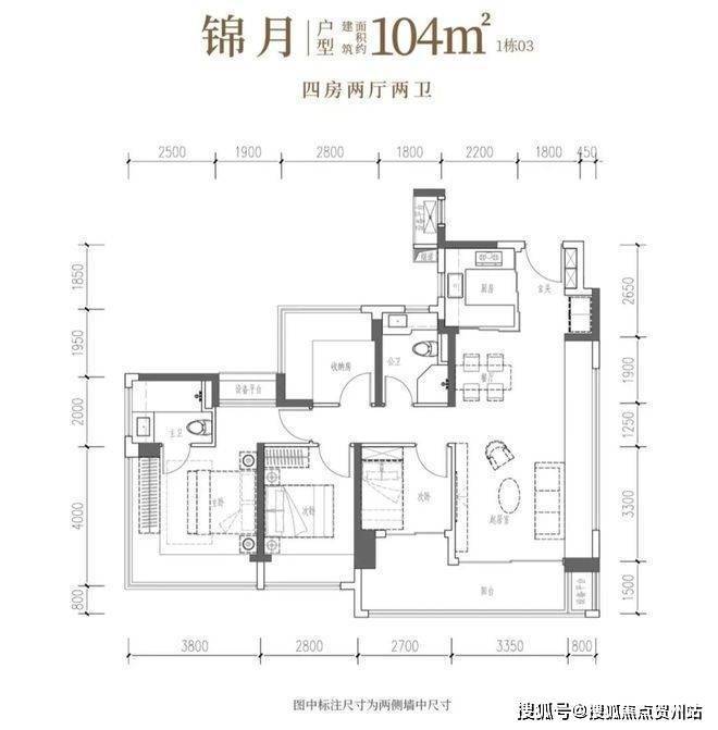 104㎡的4房2厅2卫,竖厅设计,客厅4.15米宽,LDKB布局,预留冰箱位,四房朝南。主卧270°转角窗带1.52平平台,面积分别为20.34㎡、11.2㎡、7.7㎡、6.75㎡(含墙体飘窗)。U型厨房外置烟道,卫生间干湿分区,得房率100.71%(含赠送),客厅连次卧大阳台11.23平,西南向。