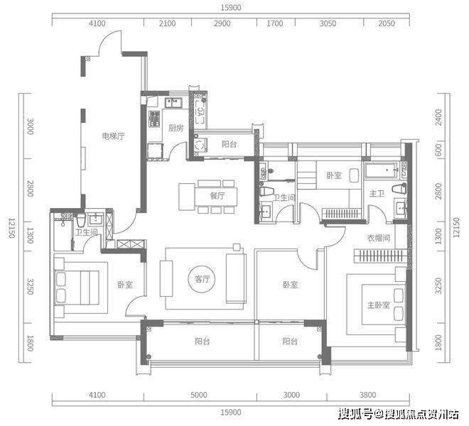 D户型建面约173㎡,4房2厅2卫