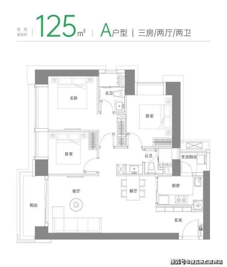 A户型 建面约125㎡三房两厅两卫