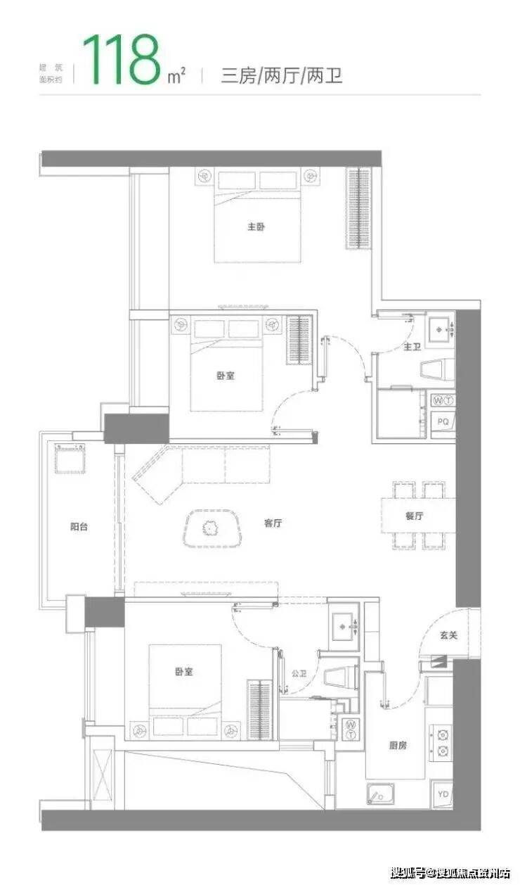 建面约118㎡三房两厅两卫