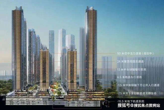 创新打造地上地下七重结构立体化交通系统,不同交通系统分层互联,人行系统、城市公共道路系统、地下轨交系统快速接驳,最大程度实现人车分流,科学化疏解交通压力。