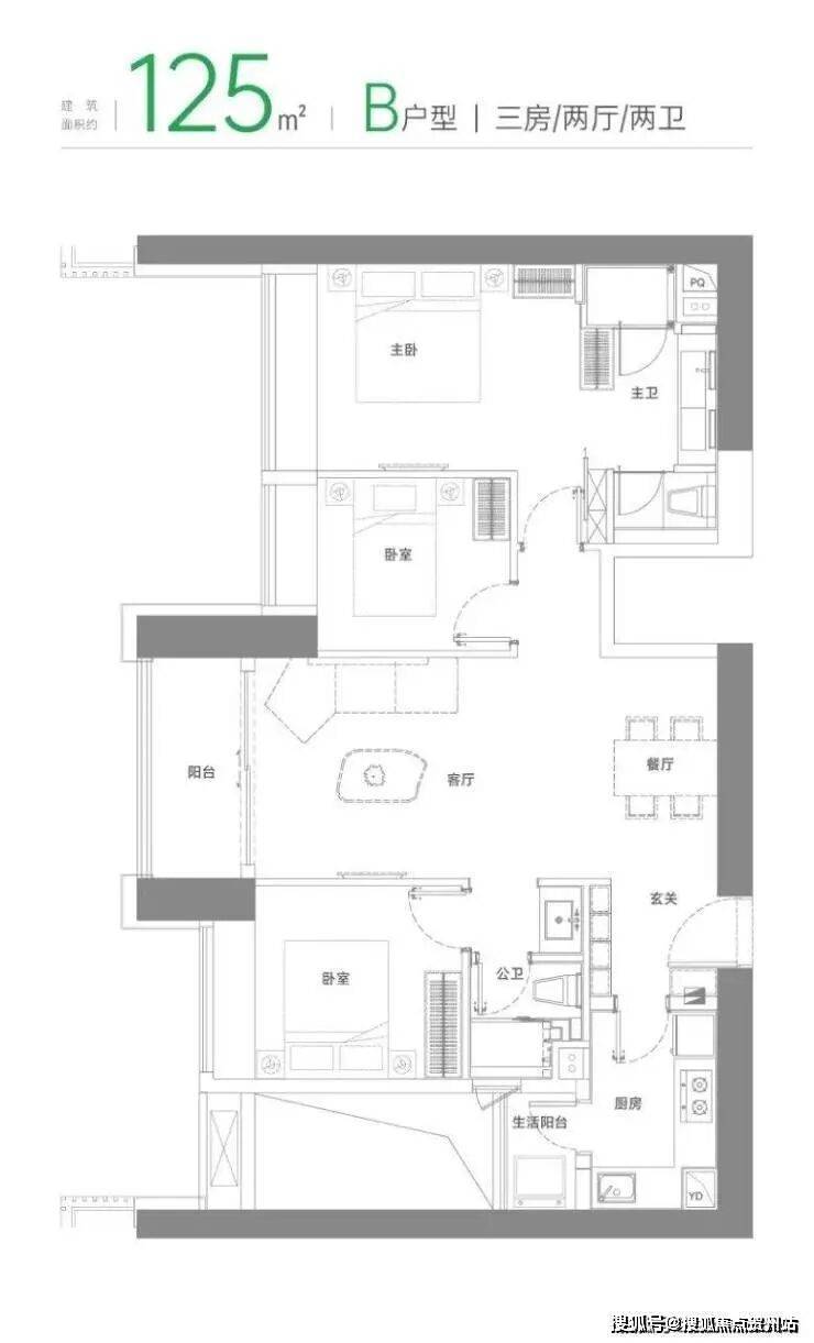 B户型 建面约125㎡三房两厅两卫