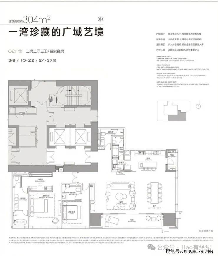 ✨ 304㎡(3300-4500万):顶豪入门王炸!奢侈两房,70㎡大客厅+20㎡阳台,南向看海、东向看湖,单身精英或三口之家闭眼冲,极致享受型