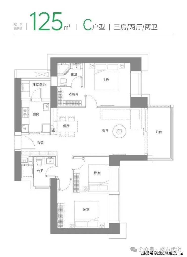 卧室标配飘窗,引入丰沛阳光,全家尽情舒展餐客一体贯通阳台,打造舒适、宽敞的欢聚天地奢享主卧,独享衣帽间、私人卫浴,自我非凡领地