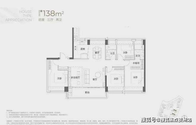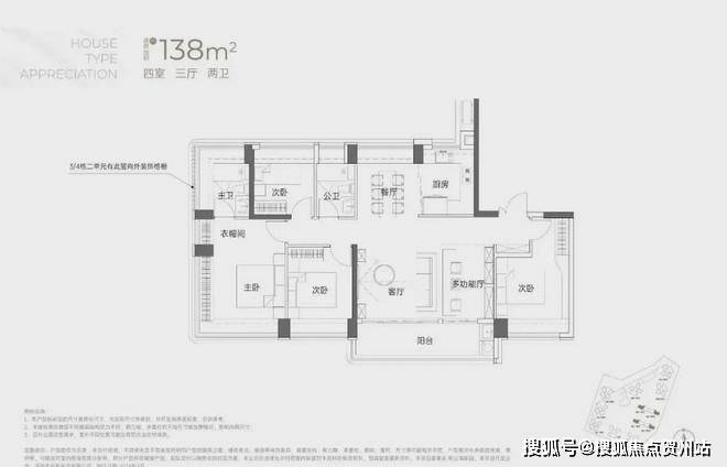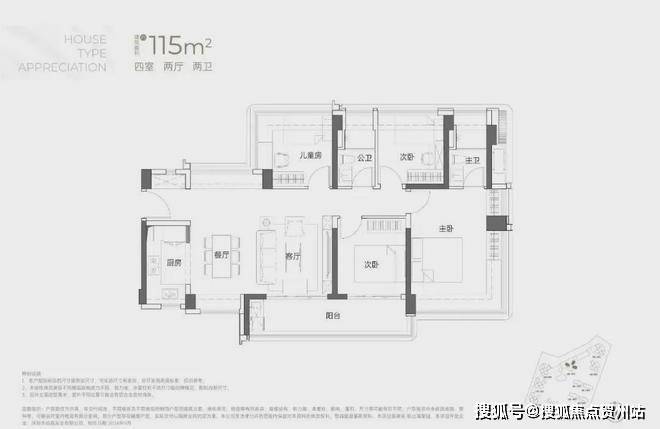 竖庭格局,西南向,基本居住功能与建面约108-110㎡4房2卫一致,但格局不一样,从目前公布的户型图上看,主要是主卧空间有了更大的提升,比如可以放更大一点的衣柜。