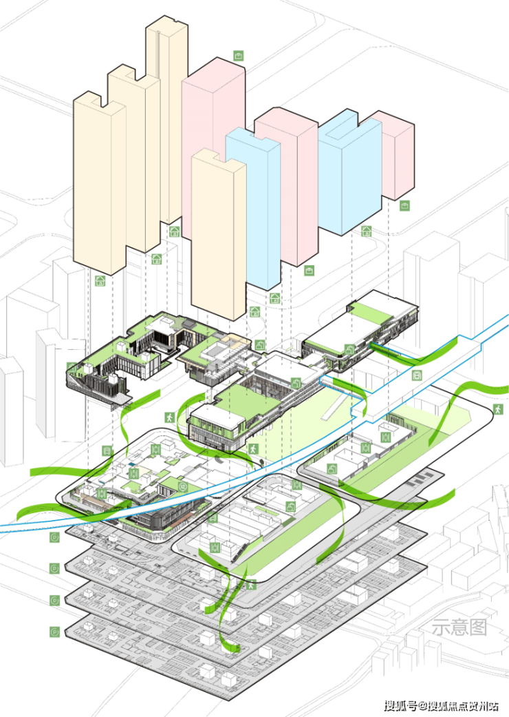 垂直交通场景:多首层设计,空中连板、无风雨连廊等,形成住宅、商业、办公与地面公交、空中地铁的接驳体系。