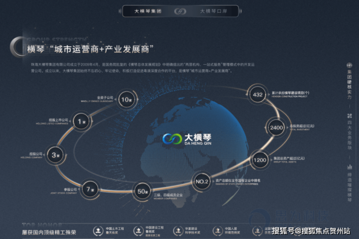 珠海大横琴集团有限公司(简称大横琴集团或集团)是珠海市国资委于2009年4月成立的直属国有企业。成立以来,大横琴集团坚守促进澳门经济适度多元发展的初心使命,是珠海国资国企践行粤澳深度合作的重要载体和骨干力量。截至目前,大横琴集团总资产超2600亿元,累计开发建设项目487个,拥有全资子公司12家、控股上市公司2家、控股公司2家、参股公司11家以及三级、四级成员企业63家。
